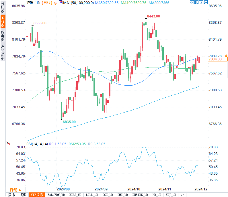 今日沪银微涨0.35%,相较于黄金表现更为坚挺。美国经济数据喜忧参半,非农数据临近,市场对美联储政策路径的预期存在分歧,贵金属市场呈现震荡态势。