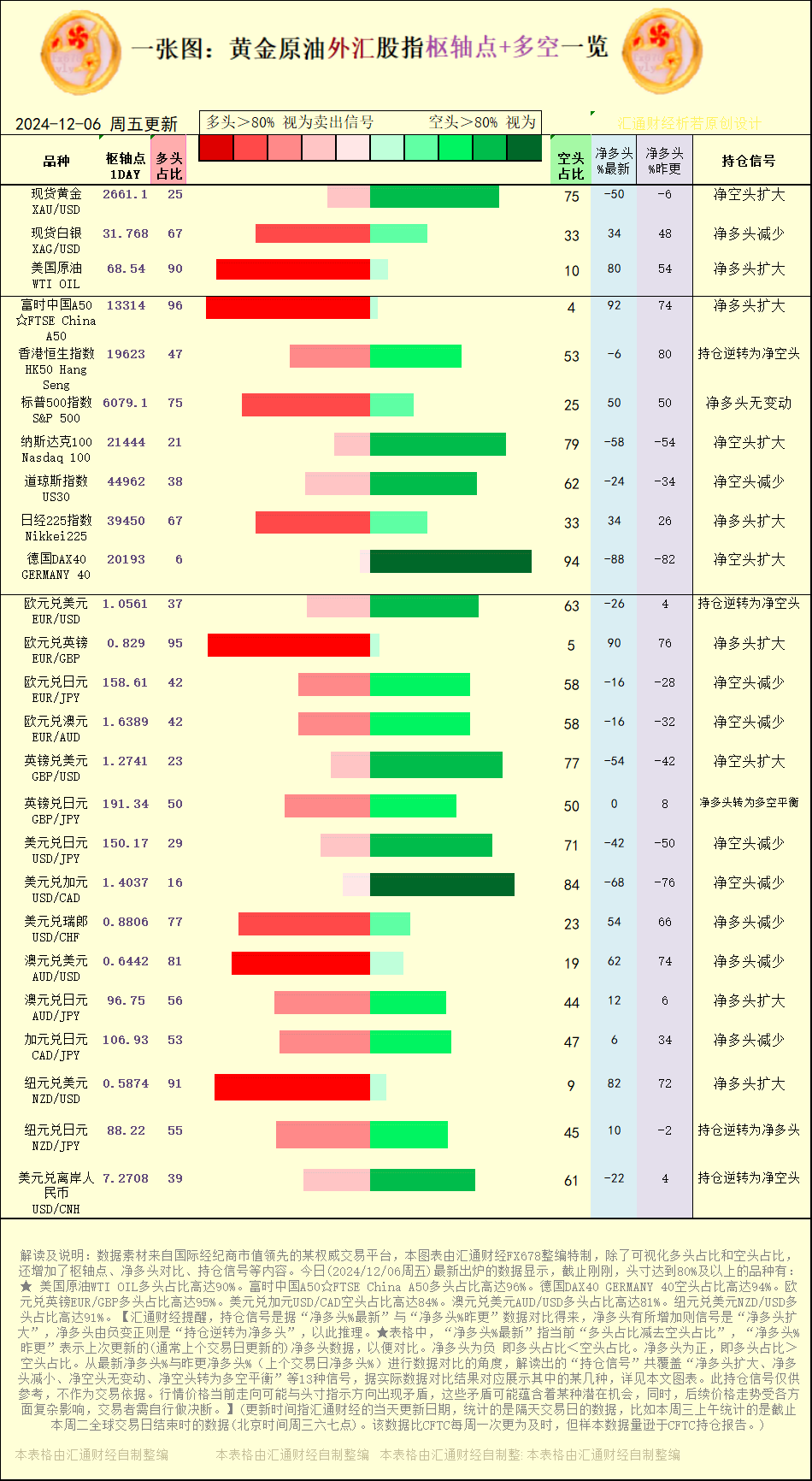 标题:一张图:2024/12/6黄金原油外汇股指“枢纽点+多空持仓信号”一览