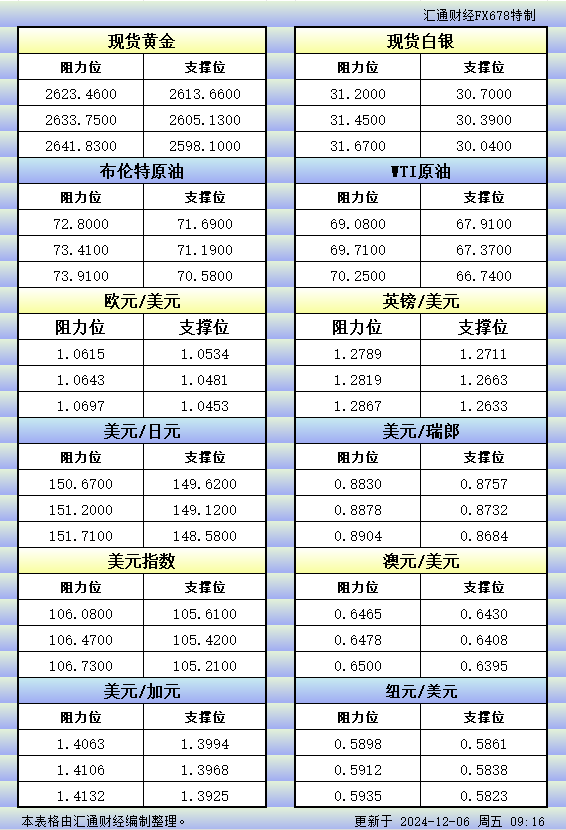 12月6日亚市更新的支撑阻力:金银原油+美元指数等八大货币对