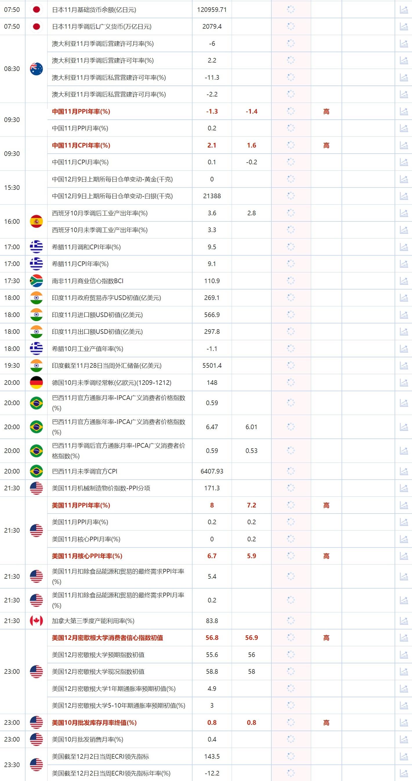 汇通财经APP讯——12月9日,投资者需要关注的重点数据:中国11月CPI年率,中国11月PPI年率,美国11月PPI年率,美国11月核心PPI年率,美国10月批发库存月率终值,美国12月密歇根大学消费者信心指数初值。需要关注的大事件包括英国央行公布通胀预期调查报告,欧洲央行管委兼塞浦路斯央行行长埃罗多托发表讲话。