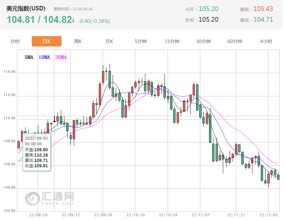 汇通财经APP讯——北京时间周五(12月9日),美元交投于104.80附近;美元周四下跌,市场预计下周美联储加息50个基点,加息预期有所放缓,美国上周续请失业金人数高于预期,金价上涨;油价下跌超1%,盘中一度刷新今年迄今最低水平至71.10美元/桶,经济衰退担忧打压油价,但因美国内布拉斯加州发现石油泄漏,限制了油价跌幅。