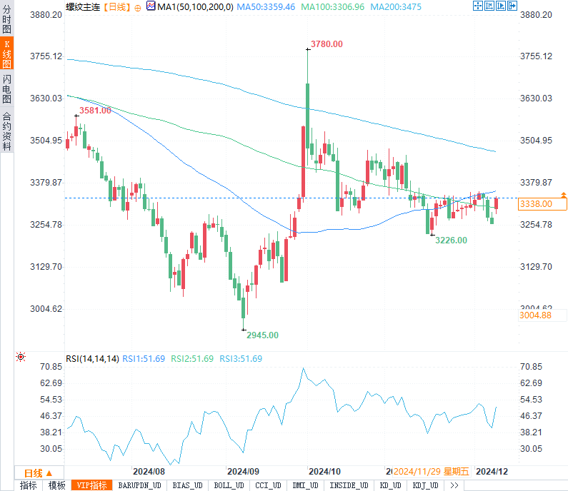 上周螺纹钢小幅上涨0.3%,主力合约收于3311元/吨。尽管气温下降令钢材市场步入传统淡季,但螺纹钢的需求表现相对突出。数据显示,五大钢消费量整体下降,但螺纹钢消费环比增加2.21万吨,总库存下降5万吨至443万吨,同比低位库存对价格形成了支撑。