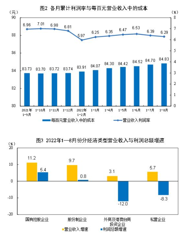 1—8月份,规模以上工业企业每百元营业收入中的成本为84.83元,同比增加1.04元;每百元营业收入中的费用为7.91元,同比减少0.51元。