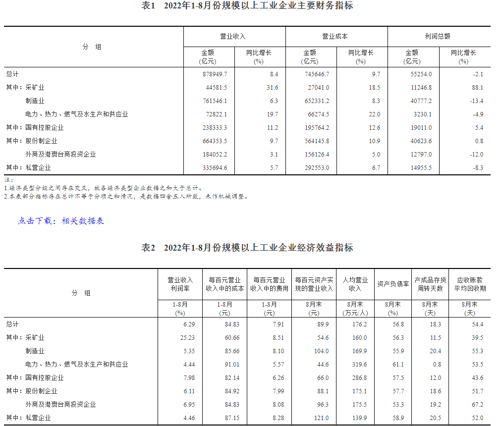 标题:2022年1—8月份全国规模以上工业企业利润下降2.1%
