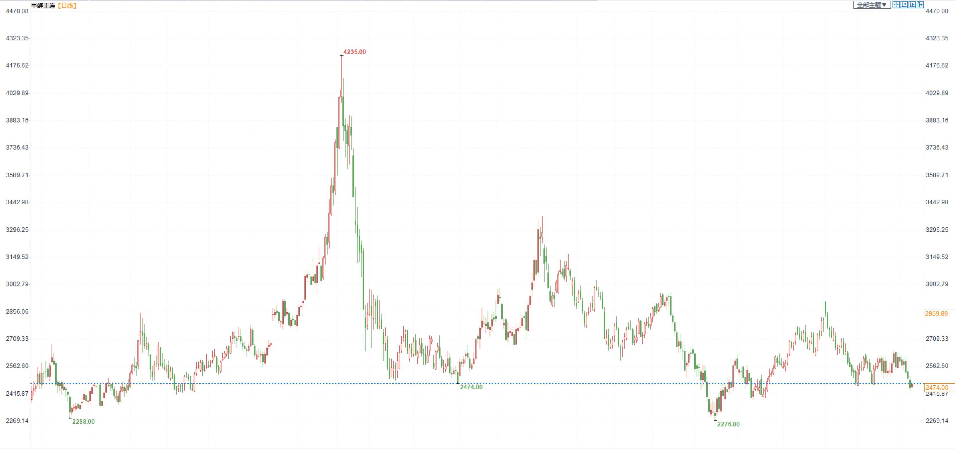 期货市场,甲醇2301合约小幅收跌,收盘价2474。现货端,港口库存较低,目前现货强势于期货。
