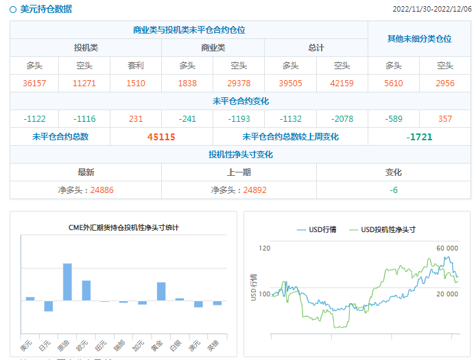 汇通财经APP讯——汇通网CFTC持仓数据:最近一周投机客持有美元的净空头头寸增加,截至12月6日的一周,美元净空头头寸猛增至22.3亿美元,为2021年7月以来最多;投机者所持原油净多头头寸减少7232手合约,至267749手合约,创三年新低。