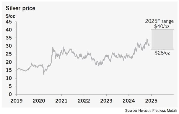 Heraeus预计,2025年白银现货价格将在每盎司28美元至40美元之间。