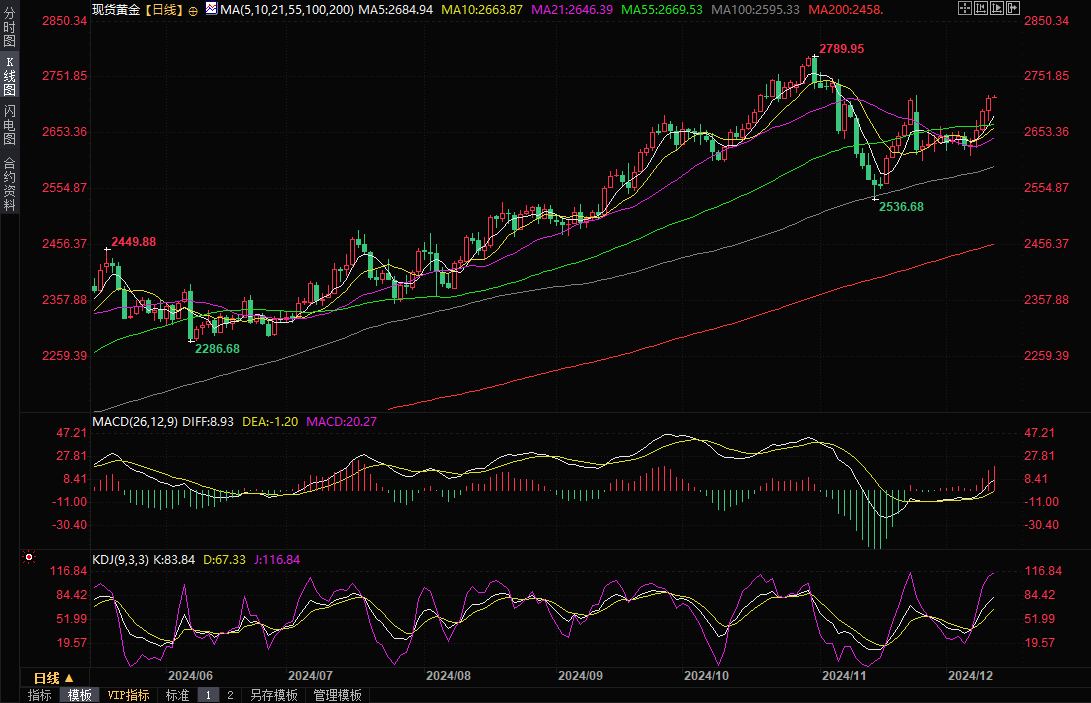 现货黄金目前交投于2719.22美元/盎司发附近。金价周三上涨逾20美元,为连续第四个交易日上涨,盘中最高曾触及2720.98美元/盎司,仅略低于11月25日创下的一个月高点2721.21美元/盎司;此前公布的通胀数据符合预期,提高了美联储下周降息的可能性,同时投资者等待美国生产者价格指数(PPI)数据为货币政策提供进一步方向。
