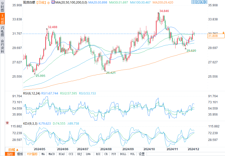汇通财经APP讯——周三(12月11日)欧盘时段,美国消费者通胀报告公布后,银价走低。市场目前正位于50日移动均线31.72美元上方,这一关键技术位可能决定其近期走势。关键上行目标位包括32.26 - 32.87美元之间的回撤区域,而下行支撑位位于31.29 - 30.61美元的支点。
