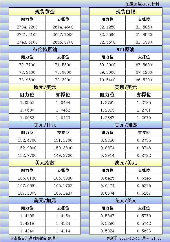 标题:12月11日美市更新的支撑阻力:金银原油+美元指数等八大货币对