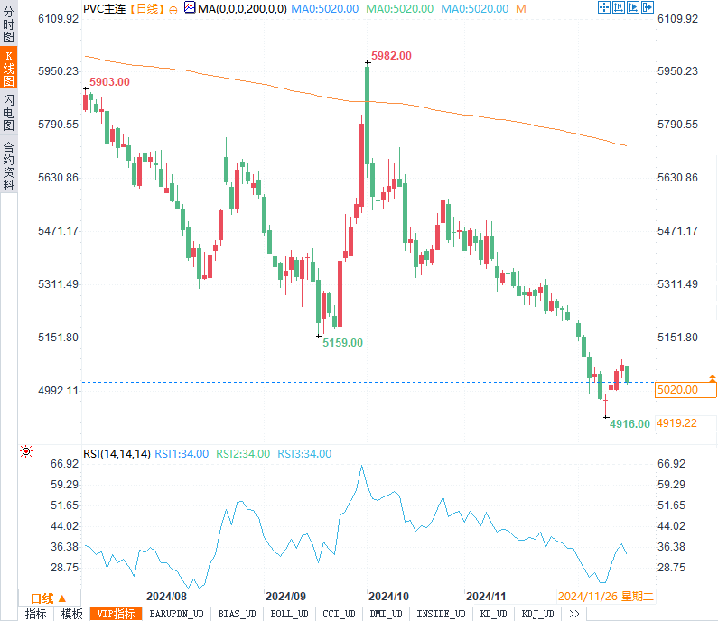 PVC价格微跌0.20%,显示市场对供需平衡的谨慎态度。目前PVC行业开工率维持高位,但需求端表现平平,下游行业的不确定性拖累了PVC的消费。短期内,市场可能以窄幅波动为主。