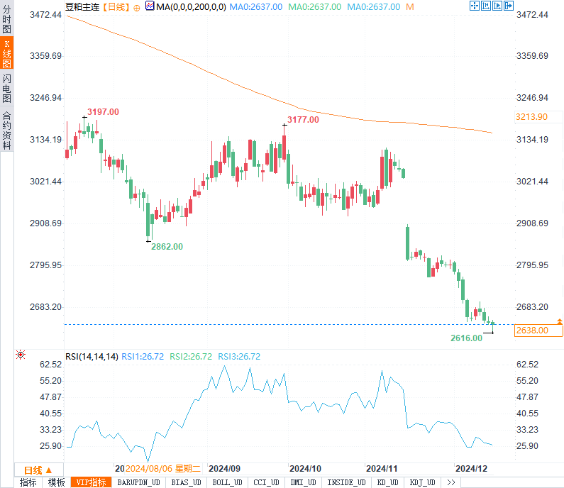 豆粕价格下跌0.98%,反映市场对饲料需求复苏的谨慎态度。尽管近期生猪存栏数据有所回升,但饲料需求增长未能显著提振豆粕价格。与此同时,美豆出口前景依然充满不确定性。短期来看,豆粕价格或将继续在供需博弈中寻求平衡。