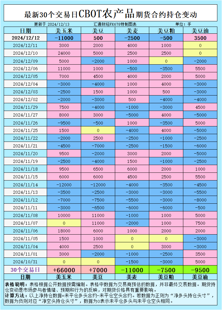 增加CBOT玉米投机性净多头;增加CBOT大豆投机性净多头;增加CBOT小麦投机性净多头;增加CBOT豆粕投机性净空头;增加CBOT豆油投机性净多头;