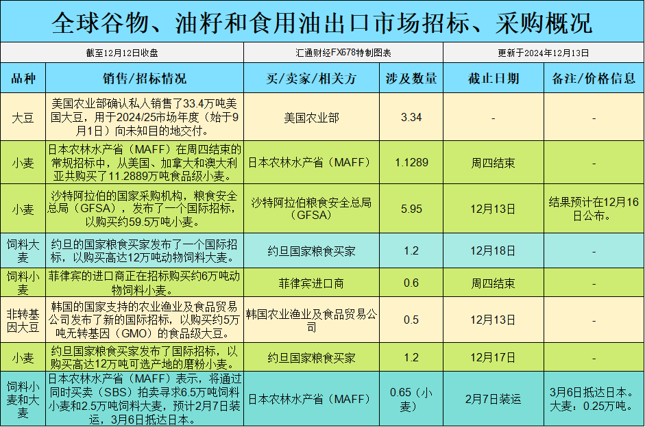 全球谷物、油籽和食用油出口市场招标、采购概况: