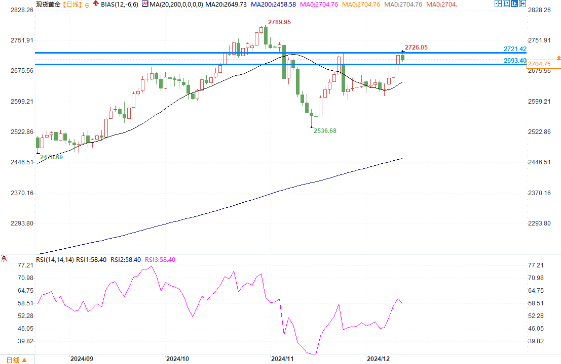 技术方面,分析师Hyerczyk进行了以下解读:12月12日周四,金价小幅下跌,未能有效收复关键阻力位2721.42美元。目前,金价受到2693.40美元水平的支撑,随后是2671.22美元和2663.51美元支撑。上涨空间依然存在,历史高点2790.17美元是潜在目标,但需要强力买盘推动才有望达成。