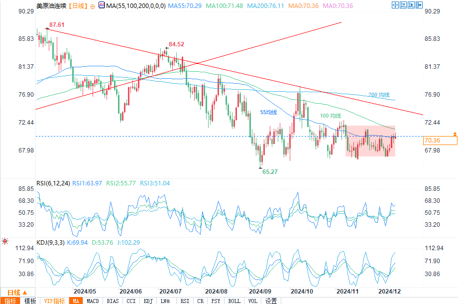 汇通财经APP讯——周五(12月13日)欧盘时段,WTI原油期货价格飙升,强势上破了50日移动均线,短期趋势看涨。北京时间22:03,WTI原油报70.36美元每桶,涨幅0.49%。
