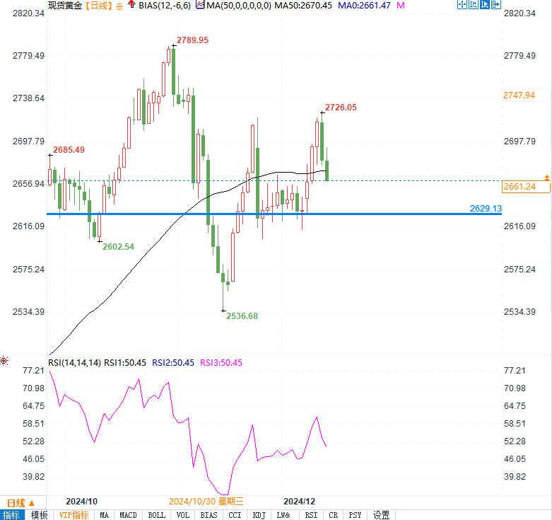 技术方面,分析师Hyerczyk进行了以下解读:12月13日周五,黄金承受下行压力,在50日均线上下波动。目前金价已跌破2663.51,可能进一步下探2629.13;相反,若突破2693.40,可能引发看涨动能,上探2726.30;
