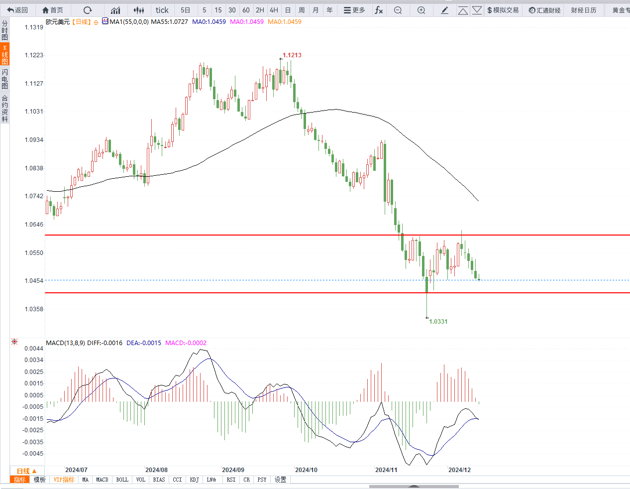 汇通财经APP讯——周五(12月13日)欧元兑美元欧盘交投于1.0460附近,基本面上欧元区降息落地,美元指数继续走强,接近箱体上沿。