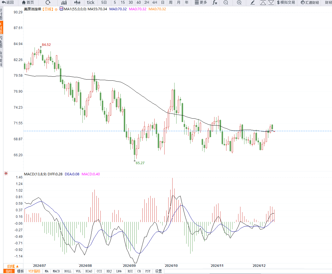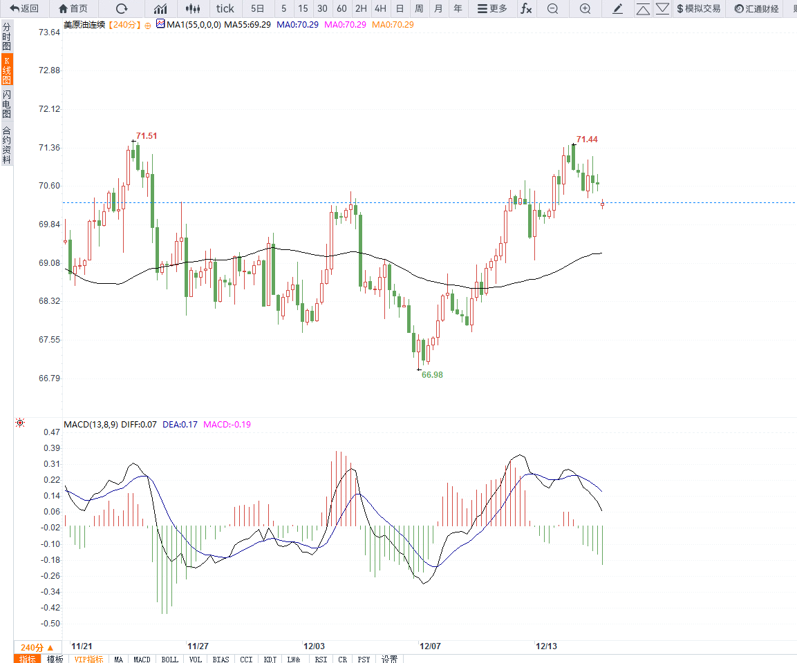 4小时级别上,MACD指标连续上涨之后出现背离,短期存在调整的需求,若盘整不破69.5美元附近均线支撑,则需要等待指标修正之后的二次反弹机会。