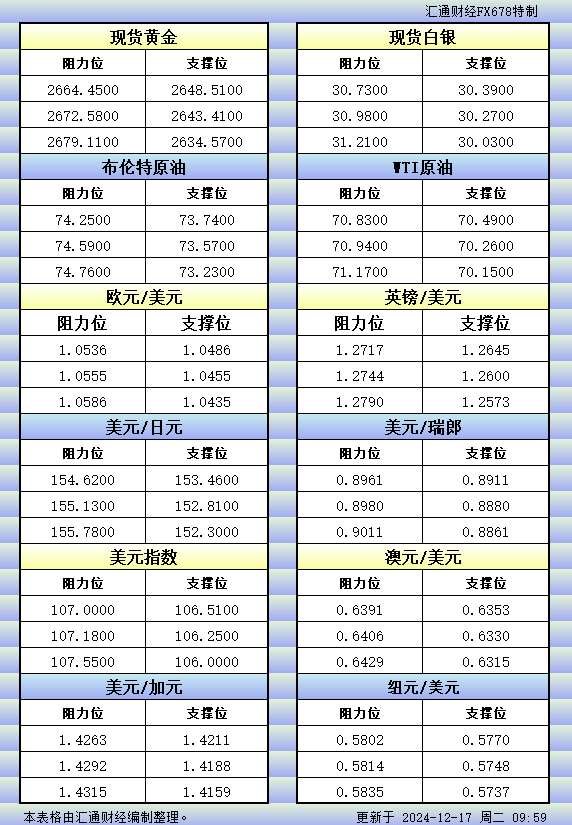 标题:12月17日亚市更新的支撑阻力:金银原油+美元指数等八大货币对