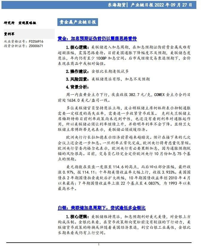 标题:【东海期货9月27日产业链日报】贵金属篇:美元指数强势,金银下行