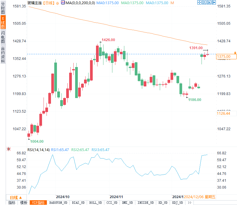 玻璃期货今日表现强势,涨幅达到1.10%。现货市场价格稳中有涨,特别是华北和华东地区,部分厂家提价意愿明显,下游刚需支撑作用仍存。此外,年底赶工需求保持韧性,带动玻璃市场交投氛围较为活跃。