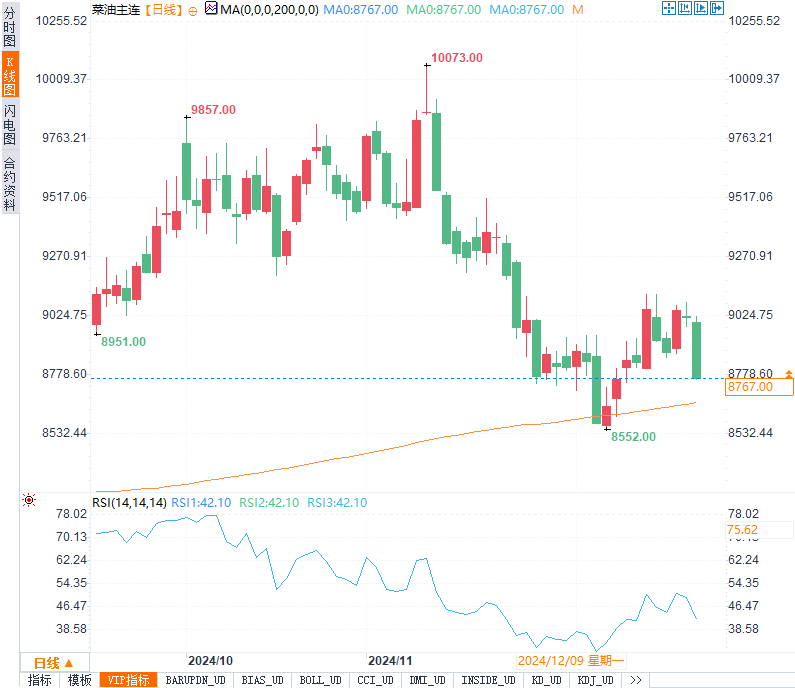 菜油期货今日跌幅显著,主要受到替代油脂价格回落的拖累。国内豆油、棕榈油价格的下行对菜油形成明显压制,同时进口油菜籽供应趋于稳定,使得市场对菜油价格的支撑进一步减弱。