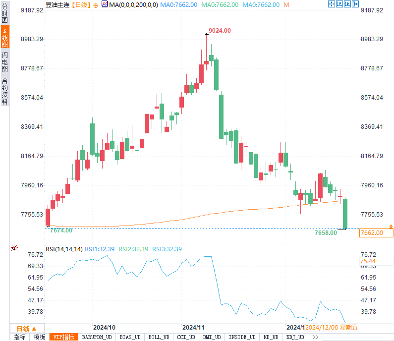 豆油期货今日跌幅达到2.54%,与棕榈油走势一致。主要受到国际油脂市场疲软影响,国内库存增长亦对价格形成压制。