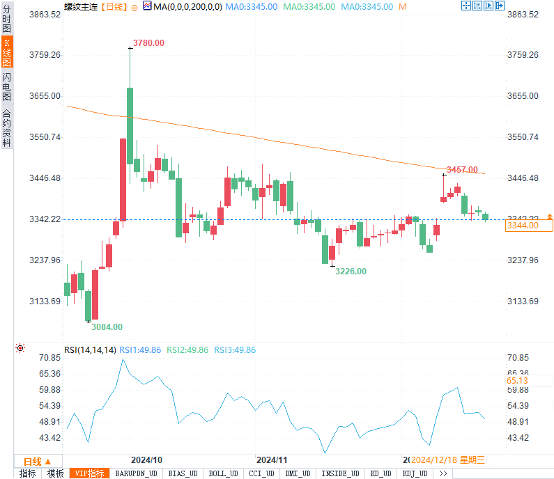 螺纹钢期货今日震荡偏弱,市场对宽松政策的预期逐步消化。尽管11月地产销售数据转正,地产需求出现边际改善,但新开工和施工数据仍处低位,表明需求回暖尚不全面。此外,当前产量较低,库存同比仍处低位,为价格提供一定支撑。