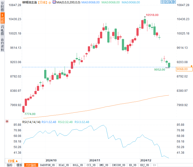 棕榈油价格今日小幅回落,主因是马来西亚出口需求疲软。12月初马来西亚出口数据低于预期,且产量季节性回升,库存压力加大。此外,原油价格在昨日波动中对生物柴油需求提振有限,进一步压制棕榈油价格。