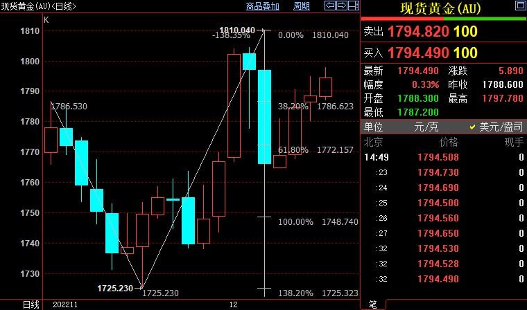 现货黄金上涨0.31%至1794.56美元/盎司;COMEX期金主力合约上涨0.30%至1806.9美元/盎司;