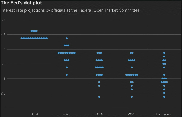 美联储宣布下调利率,并暗示鉴于失业率相对稳定且近期通胀几乎没有改善,将放慢进一步下调借贷成本的步伐。美联储决策者预计,到 2025 年底,他们将仅降息两次,每次降息幅度为25个基点。