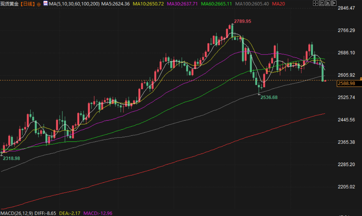 现货黄金交投于2589.55附近,金价周三下滑逾1%至一个月低点,此前美联储一如预期地降低了利率,但指出将放慢借贷成本进一步下降的步伐,从而提振了美元和公债收益率,