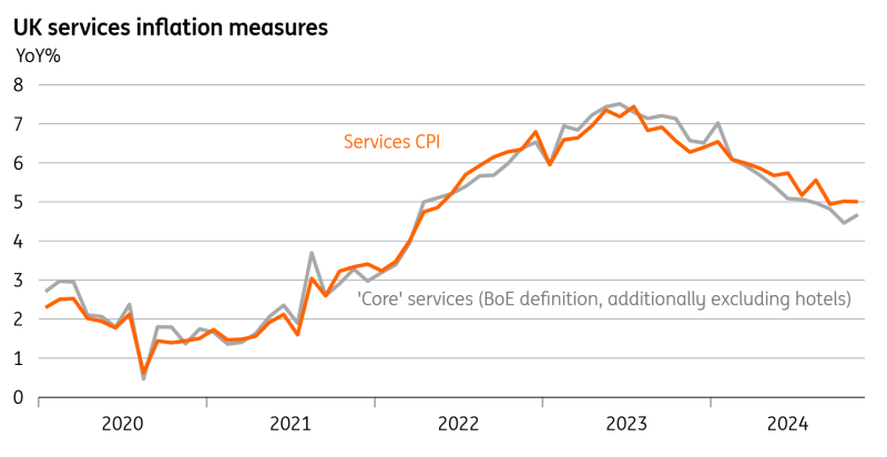 (英国服务业通胀趋势对比图,来源:Macrobond,ING)