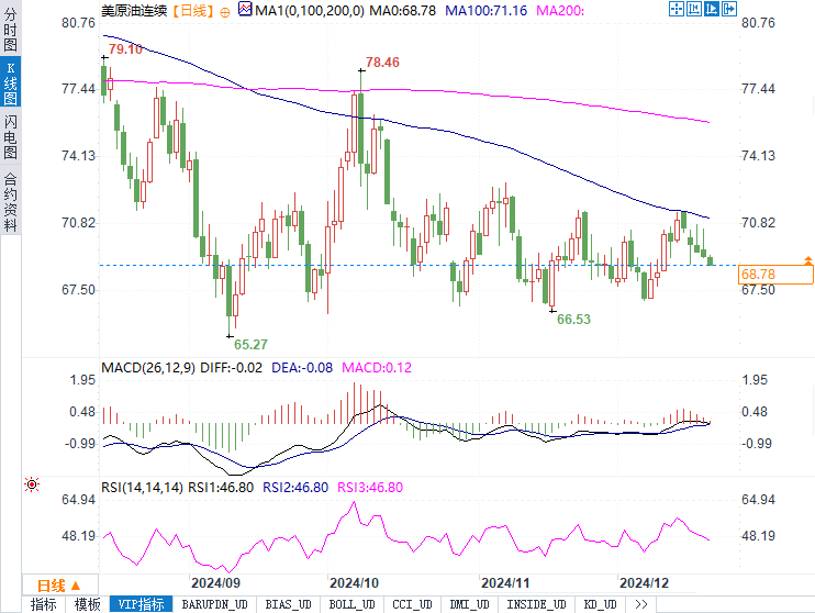 美元指数近期攀升至两年新高,主要受到美联储鹰派立场的影响。美联储在其最新的货币政策声明中强调,预计在2025年将采取更加谨慎的降息步伐,这使得市场预期未来经济增长可能受到抑制,原油需求也可能因此受到拖累。美元的强势进一步加重了以美元计价的原油的价格压力,使得非美元地区的买家在购买原油时面临更高成本,从而减少了市场的购买动力。