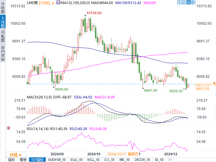 LME铜市场,尽管铜价有所回升,但其涨幅仍受到美元走强的制约。从技术面来看,铜价当前的支撑位在8869美元附近,一旦失守该位置,铜价可能进一步回落至8500美元区域。上涨则面临9000美元的阻力位,突破这一关口将可能引发短期内的进一步上涨,但需要注意的是,美元的强势仍将是限制铜价上涨的关键因素。