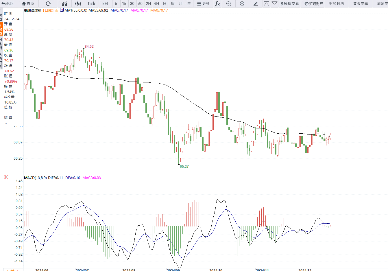 美原油报收70.17美元/桶,重回区间震荡中轴线附近,2024年油价整体呈现震荡下行走势。