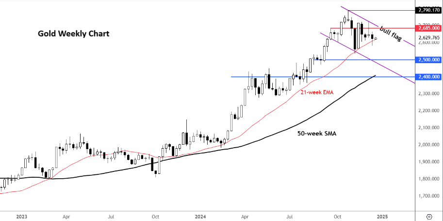 但长期基本面仍然具有支撑性——2025 年可能达到 3000 美元?尽管存在短期挑战,3000 美元的金价目标仍然可行。 2025 年初可能会带来调整或盘整,但这可能会吸引逢低买入者和寻求逢低买入的长期投资者,尤其是那些错过了 2024 年金价上涨的投资者。
