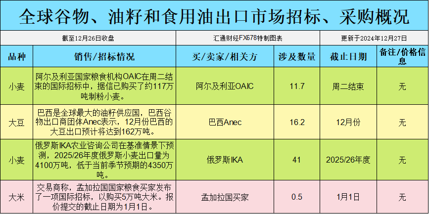 全球谷物、油籽和食用油出口市场招标、采购概况: