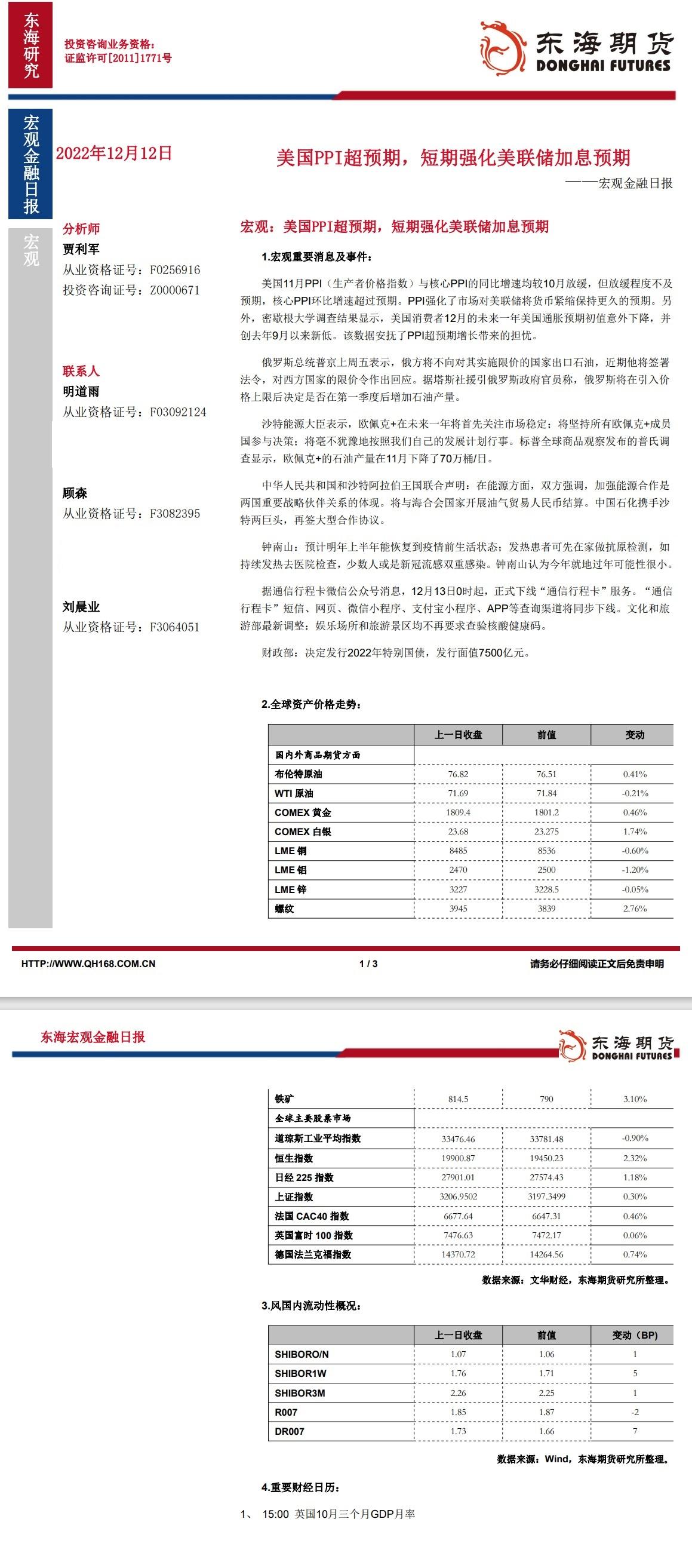 标题:【东海期货12月12日宏观金融日报】:美国PPI超预期,短期强化美联储加息预期
