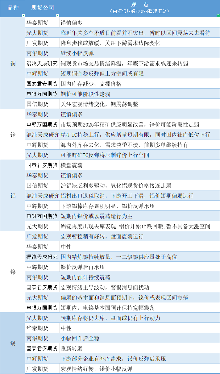 汇通财经APP讯——期货公司观点汇总一张图:12月26日有色系(铜、锌、铝、镍、锡等)。更多详见本文的汇通财经特制图。