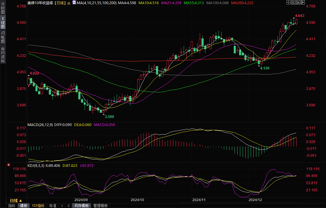 美国 10 年期国债收益率上周五比周四盘尾上升 1.2 个基点,达到 4.596%。该收益率上周四一度触及 4.641%的 5 月 2 日以来最高水平,在当日下午强劲的七年期国债标售后有所回落。