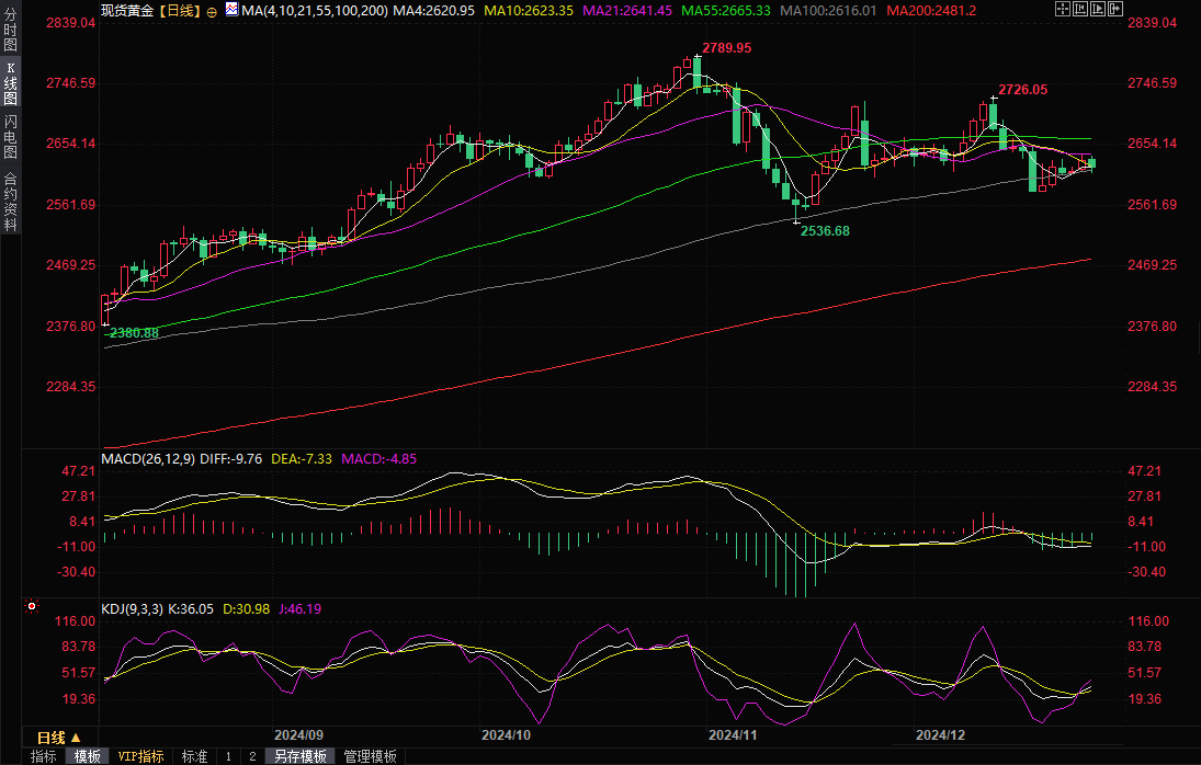 汇通财经APP讯——现货黄金上周五(12月30日)收盘下跌0.48%,收报2620.96美元/盎司,勉强守在100日均线2616.01上方,因美国国债收益率上升,在假期稀少的交投中削弱了非孳息黄金的吸引力,市场关注当选总统特朗普的回归,以及他的通胀刺激性政策对美联储2025年前景的潜在影响。