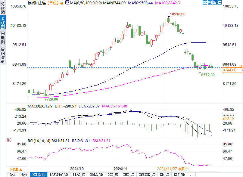 从基本面来看,棕榈油价格受到供需关系、政策影响和外部市场环境等多重因素的共同作用。近期,印度的进口需求急剧增加,10月份的棕榈油进口量较前月飙升59%,达到了三个月来的高位,这一需求的增加为棕榈油价格提供了支撑。