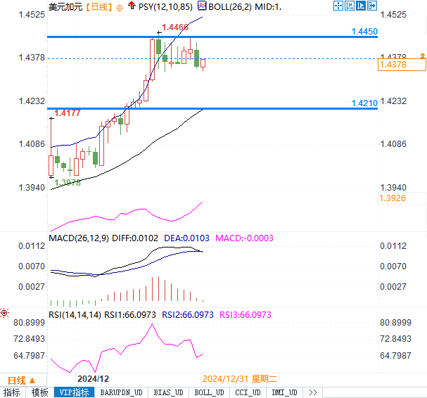 原油作为加拿大的主要出口商品,其价格波动直接影响加元的表现。近期,市场对能源需求的乐观情绪有所回升,推动了原油价格走高,从而为加元提供了支撑。同时,在新年假期即将到来之际,市场交投趋于清淡,市场更倾向于等待更多的宏观经济数据和政策指引,这也使得美元/加元的波动性受到抑制。