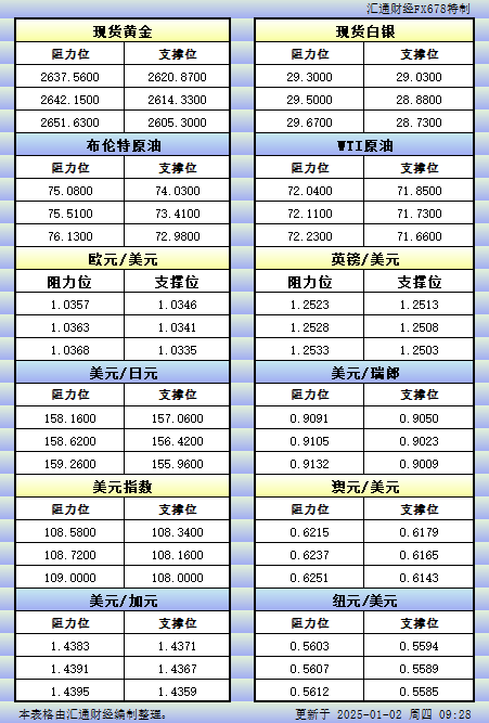 1月2日亚市更新的支撑阻力:金银原油+美元指数等八大货币对