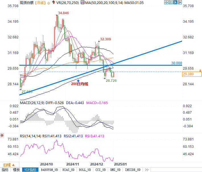 短期趋势:短期来看,白银价格受益于国债收益率回落及技术性反弹。然而,若价格无法有效收复29.40美元,则可能面临再次回调的风险。