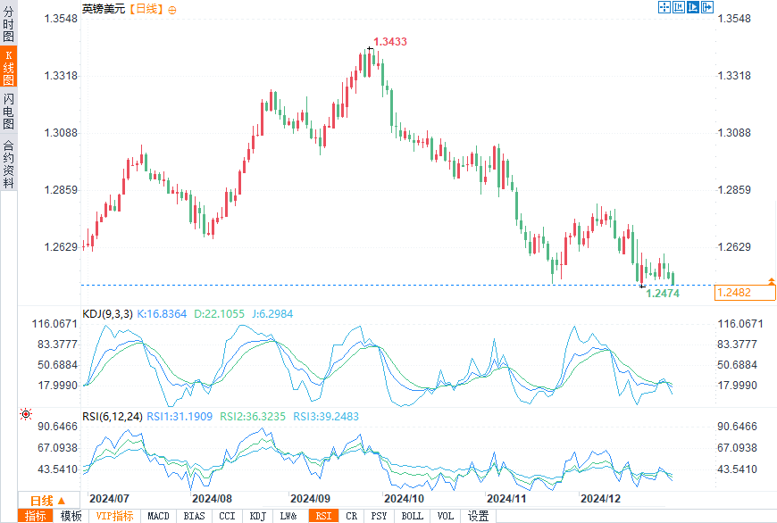 周二,英镑虽尝试反弹却迅速回落,当前市场交投清淡,难以突破现有区间。不过,随着1月10日就业数据临近,市场后续可能跌破1.25关键支撑,尽管美元偶尔小幅回调,但整体依然强劲。1.2750现阶段或是上行天花板,做空英镑/美元更为适宜,若跌破1.2450,后续恐跌至1.23乃至1.21。同时,美国高利率促使美元长期高位运行,英镑相对其他货币虽表现尚可,但本质是美元全球强势主导,而非英镑自身问题。
