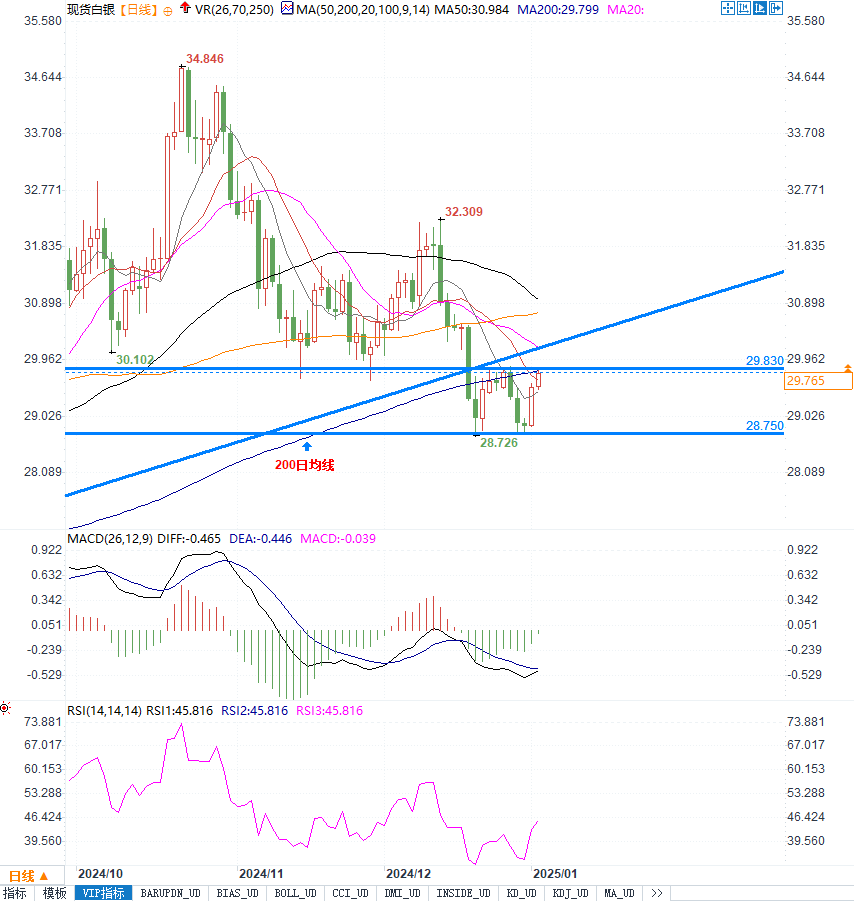 从技术面来看,白银价格目前正接近关键的200日均线,该均线位于29.83美元附近。此水平是市场关注的重要技术关口,一旦有效突破,将可能引发更多的买盘,推动价格进一步上涨。