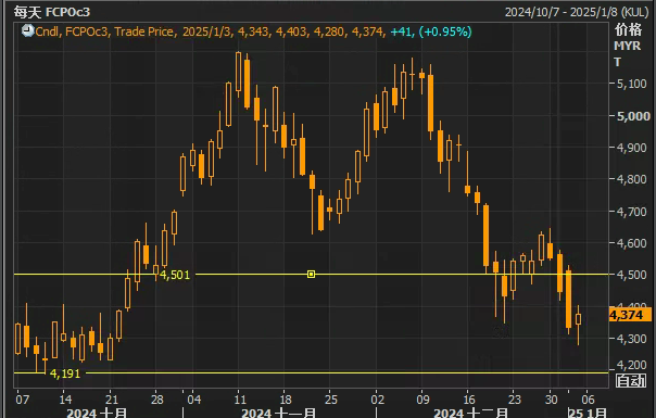从技术面来看,近期的价格走势显示出一定的波动性。虽然市场在1月初出现了部分反弹,但过去一周的跌幅仍不可忽视。值得关注的是,近期棕榈油价格在突破关键支撑位后出现了反弹,显示出市场有一定的恢复力。然而,由于全球经济仍在面临不确定性,短期内棕榈油期货价格可能会在4200-4500马币区间震荡整理,投资者应关注接下来的基本面变化,尤其是印度和印尼的政策动向对市场的影响。